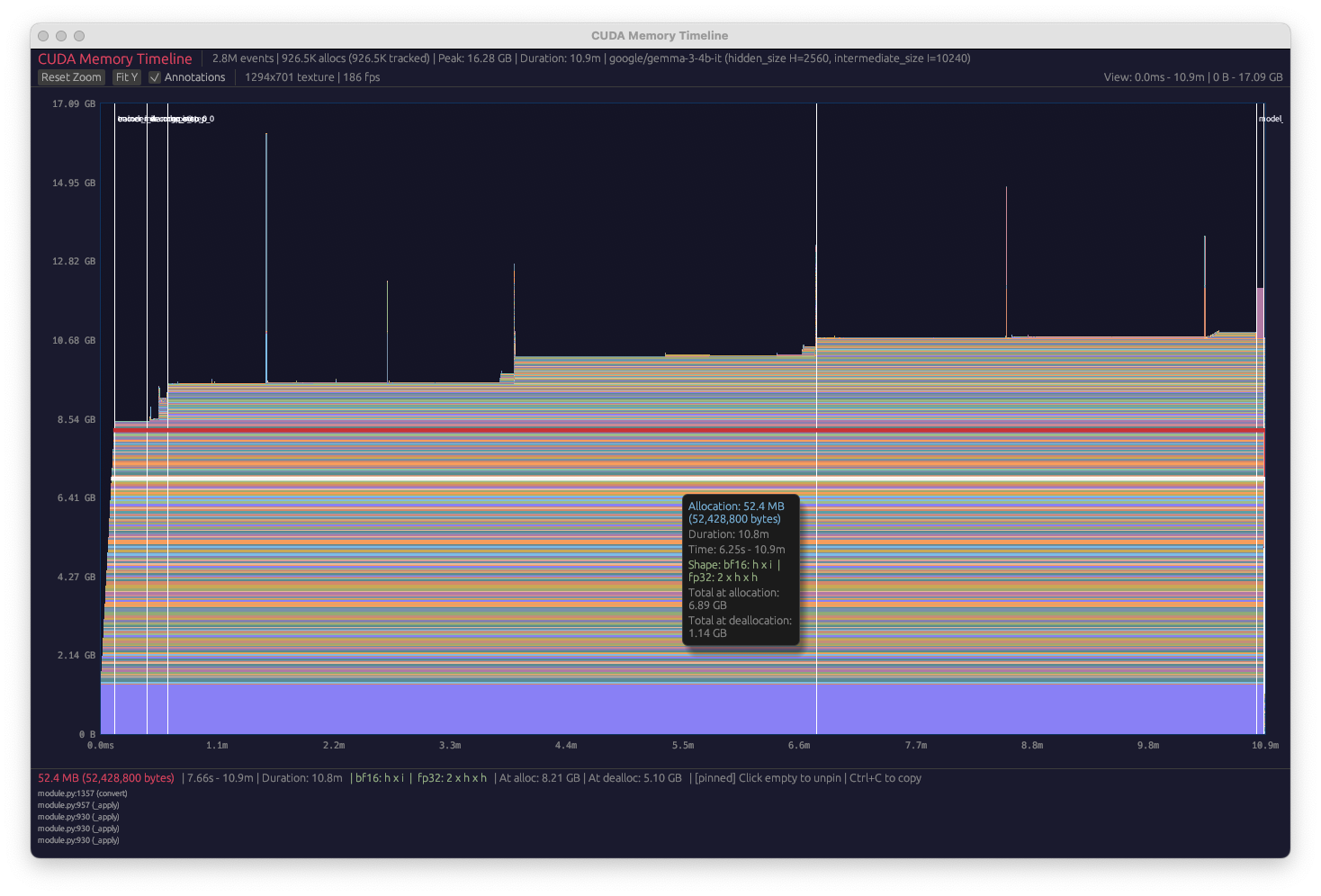 Torch has an invaluable tool called _record_memory_history which keeps a record of all CUDA allocations and frees. Once this is saved to disk, the profile can be parsed and create a stacked bar chart of all memory allocated at a particular point in training. This is very useful for noticing many issues.